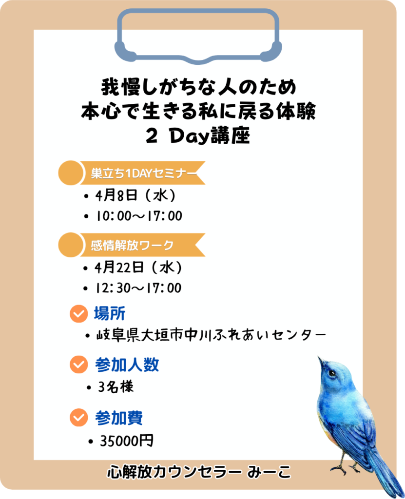 【 募集中】4/8・4/22 我慢しがちな人のため ~ 本心で生きる私に戻る体験2 Day講座 ~ / みーこ 2026-03-17 elysium 我慢しがちな人のために。。 巣立ち1DAYセミナー 感情解放ワークを体験する 2DAY講座です ページのトップへ Published by elysium elysium のすべての投稿を表示